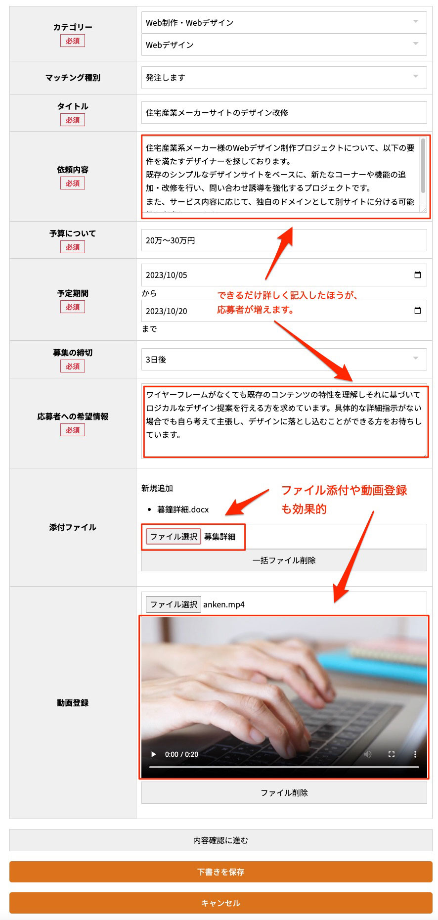 できるだけ詳しく記入したほうが、案件について理解が深まるため、応募者が増えます。また、文字だけで伝わりにくいことは、画像やPDFを添付したり、スマホで撮影したショート動画(1分まで)を投稿することで、案件の内容をスムーズに案内することができます。