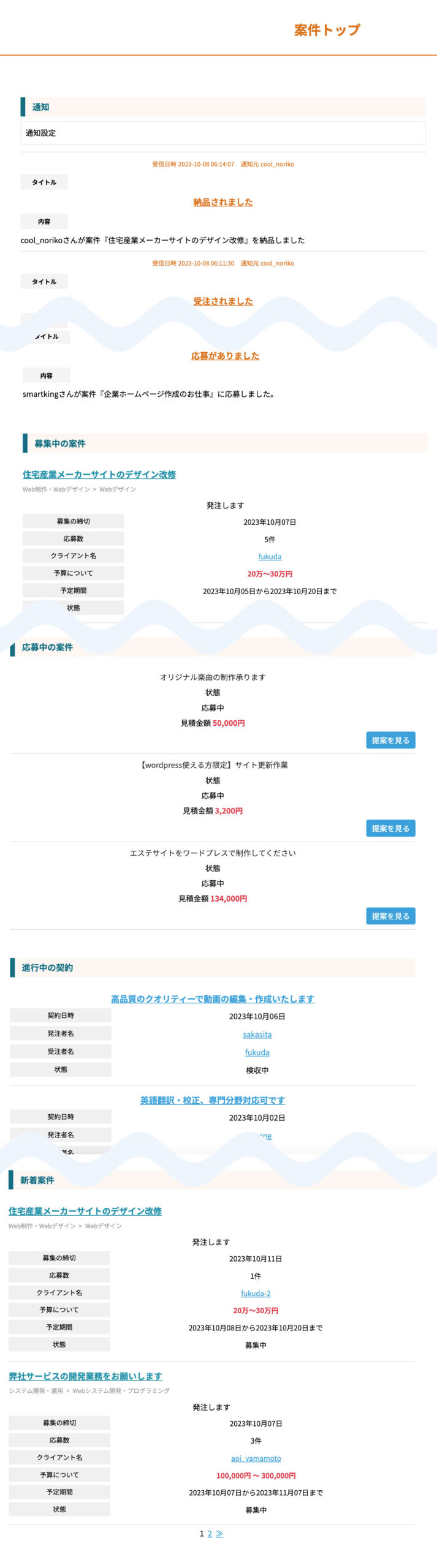 マッチングに関する情報を集中管理するためのページです。通知、募集中の案件、応募中の案件、進行中の契約、新着案件がまとめて表示されますので、必要な情報にすぐにアプローチできます。