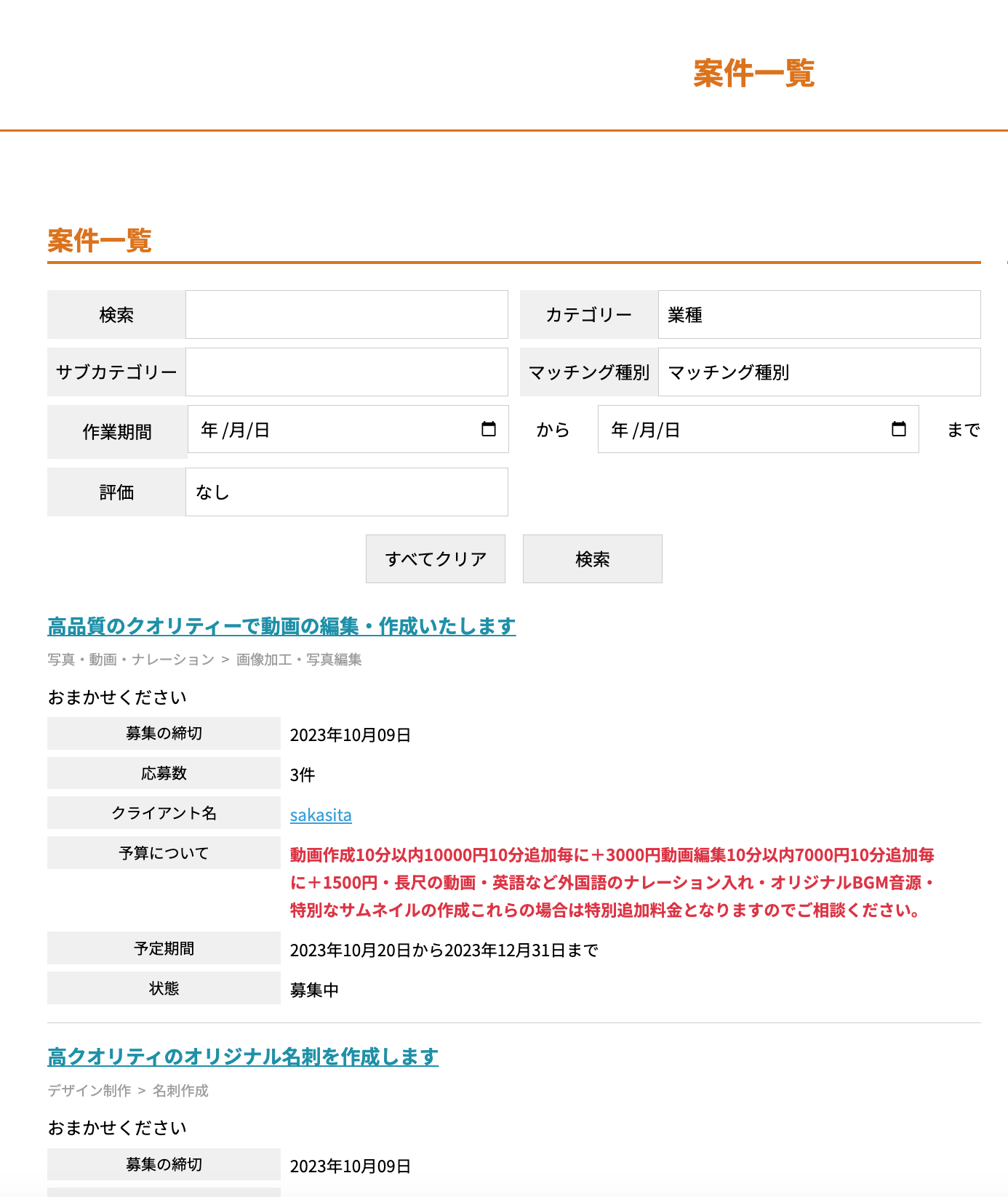 サイドメニューの「案件一覧」をクリックすると。案件一覧ページが表示されます。システムに登録された、現在募集中の案件だけが一覧表示されます。