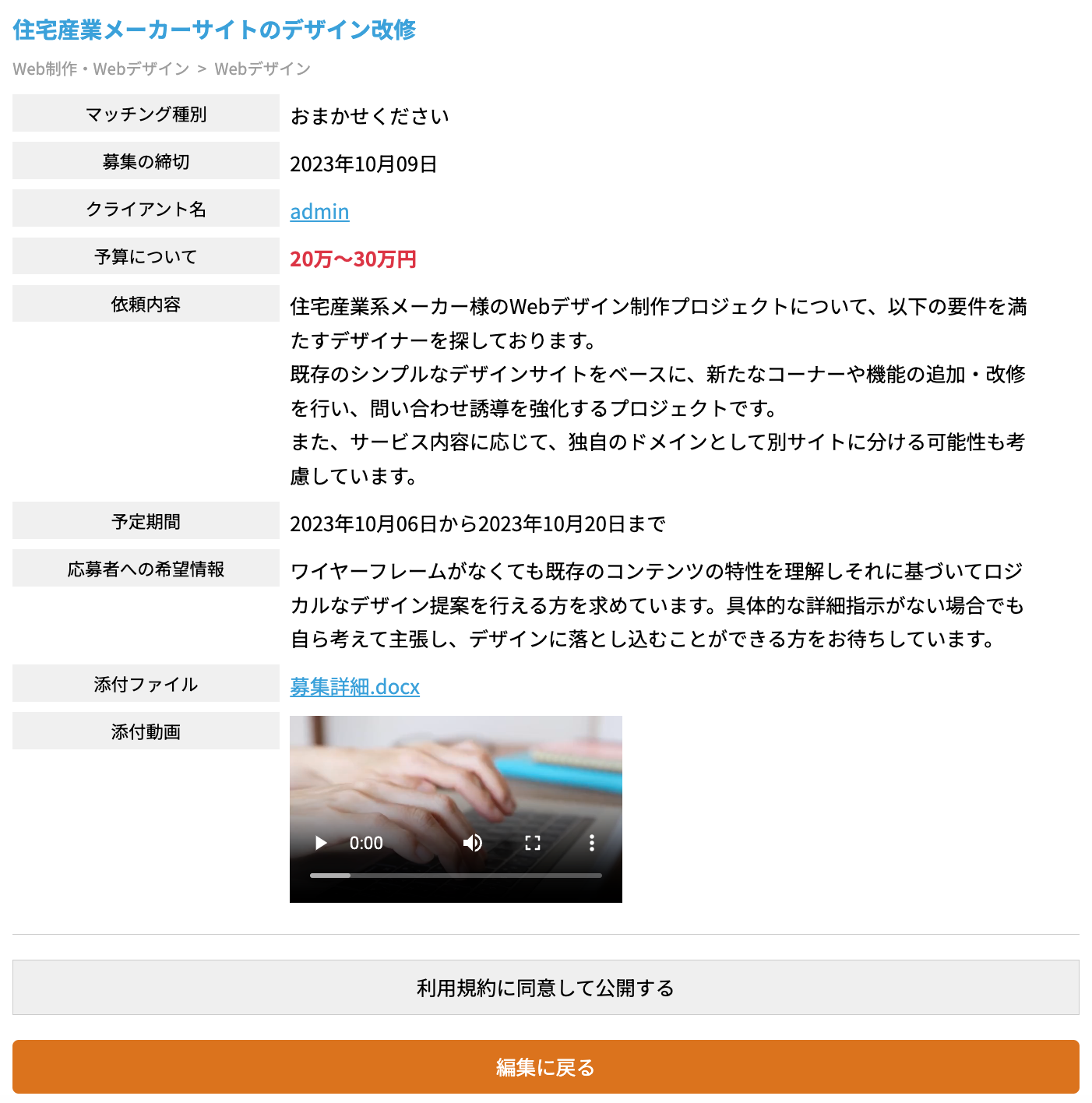 「利用規約に同意して公開する」をクリックすると案件がシステムに登録され、全会員が閲覧できるようになります。また新着情報にも表示されます。 「編集に戻る」をクリックすると案件登録ページに戻ります。