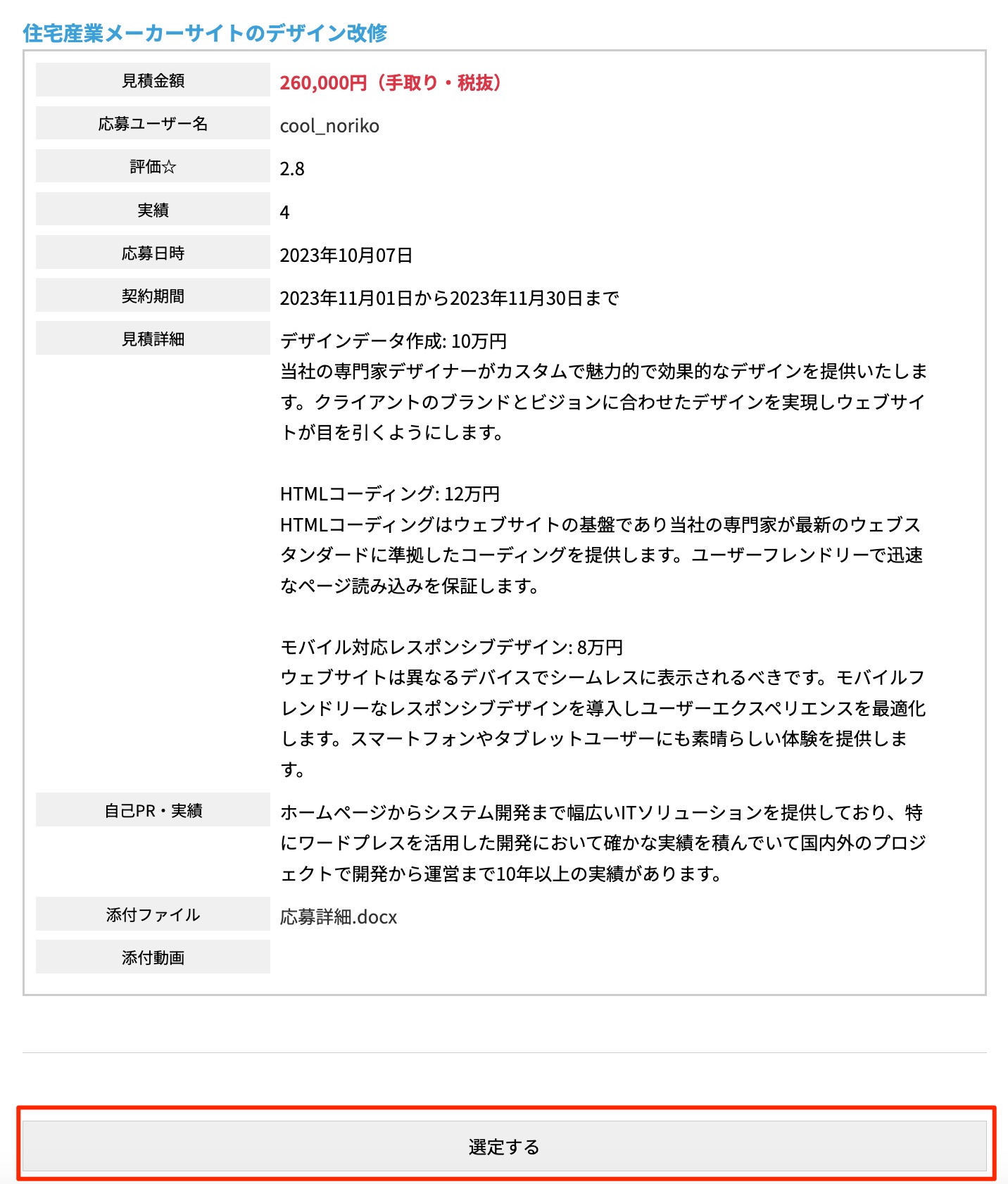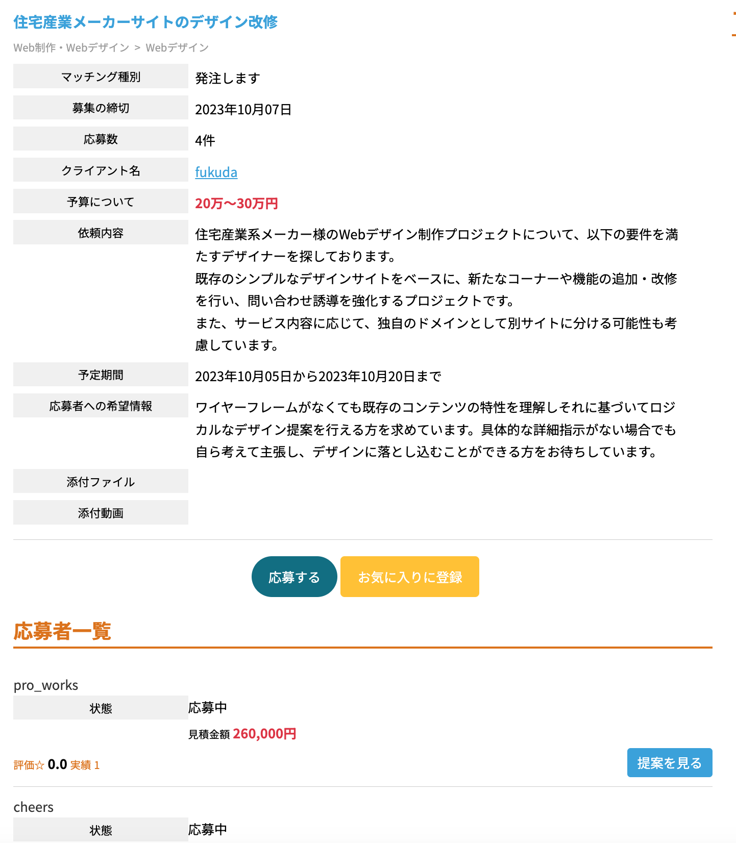 興味ある案件をクリックすると、案件表示ページに案件の詳細が表示されます。