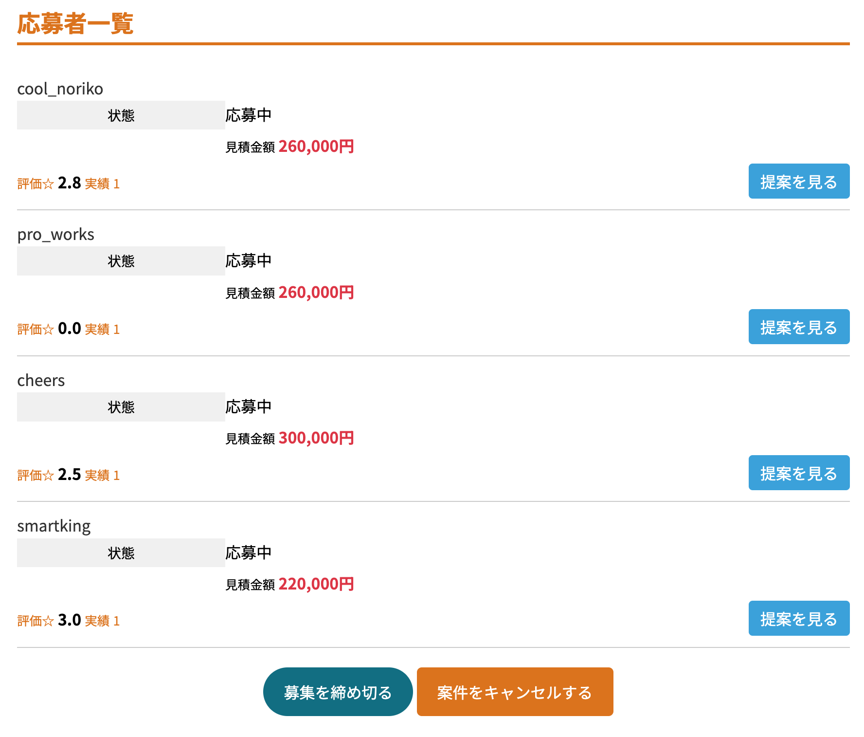 応募者も同様に案件表示ページの応募者一覧で自分の応募を確認できます。