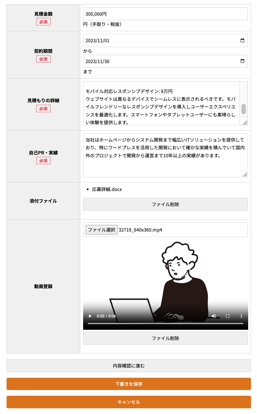 案件表示ページから「応募する」をクリックすると、案件応募ページが表示されます。できるだけ詳しく記入したほうが、応募内容を理解してもらいやすく、選定される可能性が高まります。また、文字だけで伝わりにくいことは、画像やPDFを添付したり、スマホで撮影したショート動画(1分まで)を投稿することで、応募の内容をスムーズに表現することができます。