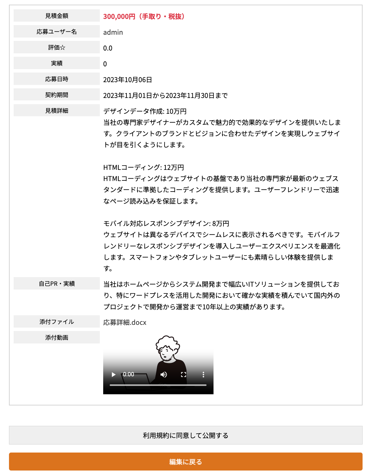 「利用規約に同意して公開する」をクリックすると応募がシステムに登録され、案件登録者が閲覧できるようになります。 「編集に戻る」をクリックすると案件応募ページに戻ります。