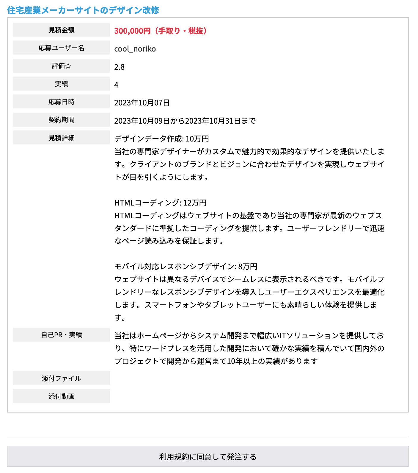 条件が合致して契約ボタンをクリックすると契約に移ります。案件登録者と応募者の双方がシステム上で契約に合意すると、契約が成立します。