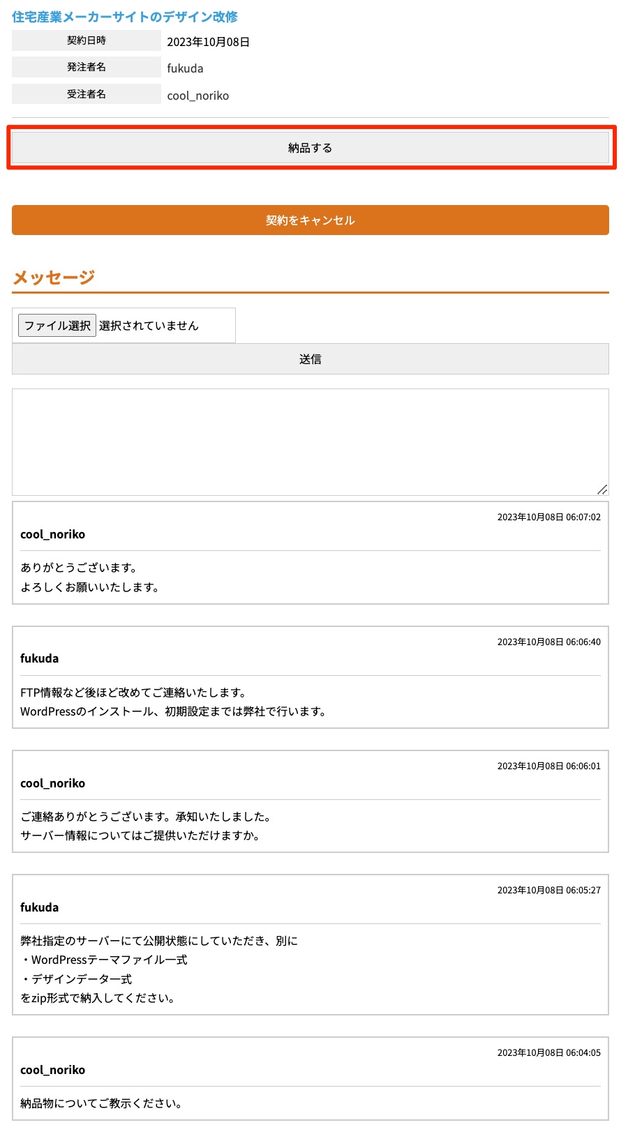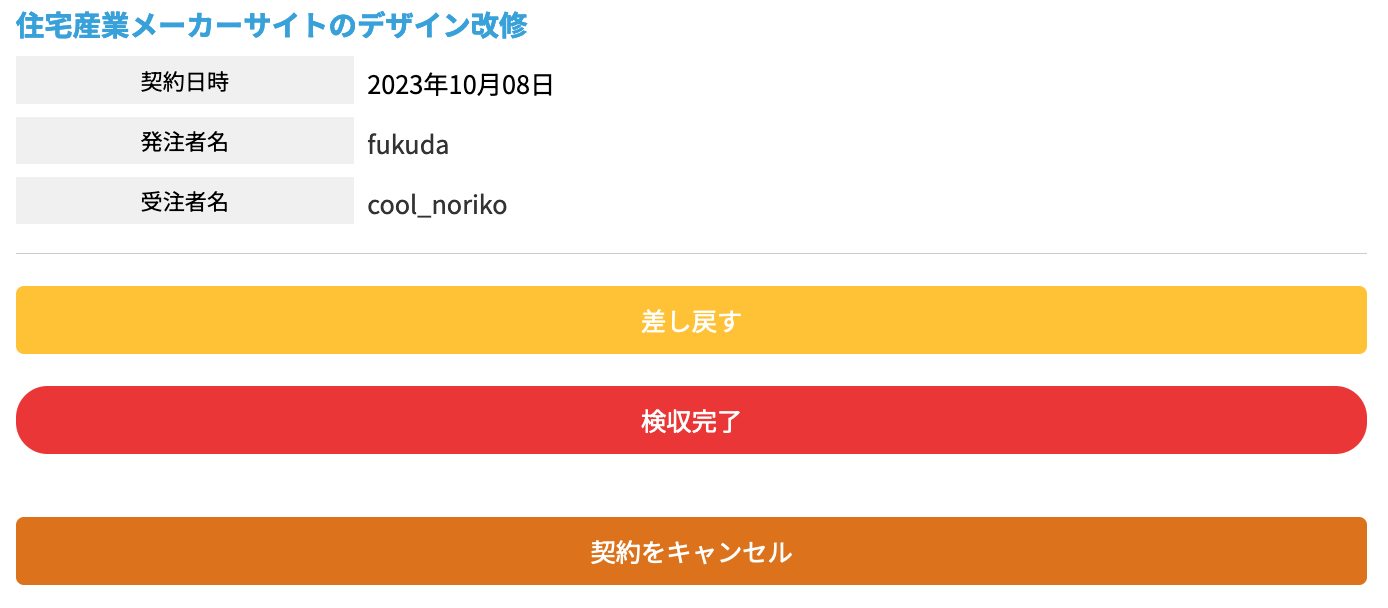 受注者が「納品」をクリックすると、発注者の「検収完了」がクリック可能になります 発注者は納品物を確認して、問題が無ければ「検収完了」がクリックしてください。 納品物に問題があれば「差し戻し」をクリックしてください。 このようにシステム上で契約を管理することができます。
