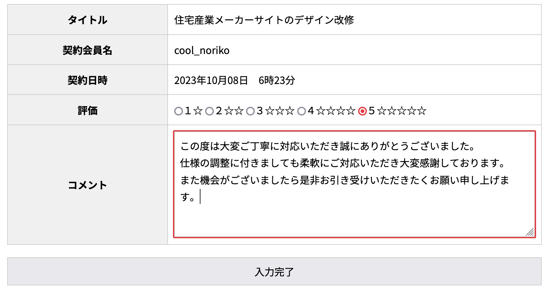 契約業務が終了すると、発注者と受注者がそれぞれ相手の評価をすることができます。これは他の会員がマッチングする際に貴重な情報となるので、ぜひ入力してください。