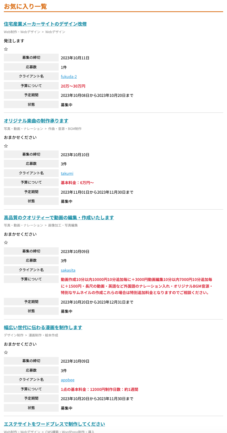 サイドメニューの「お気に入り一覧」をクリックすると、お気に入りに登録した案件が一覧表示されます。