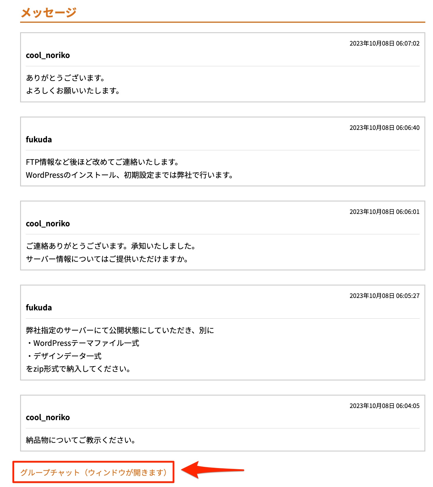 契約表示ページの一番下にある【グループチャット】機能を使用すると、会員だけでなく非会員も交えてグループチャットができます。